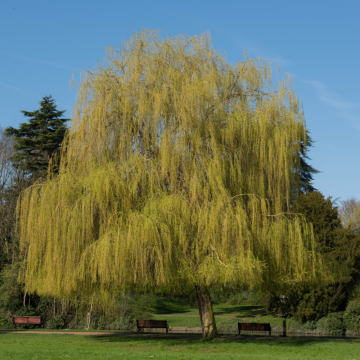 Le Salix sepulcralis ‘Chrysocoma’, également appelé Saule pleureur doré, est un arbre ornemental spectaculaire, apprécié pour sa silhouette élégante et ses branches pleureuses. Ce saule se distingue par ses longues branches souples qui tombent en cascade, créant un effet visuel léger et raffiné.Au printemps et en été, ses feuilles sont d’un vert vif et frais, mais c’est à l’automne que ce saule révèle toute sa beauté, avec un feuillage qui prend une teinte dorée éclatante, apportant une touche lumineuse à l’espace extérieur. Ce changement de couleur fait du ‘Chrysocoma’ un arbre incontournable pour les jardins d’automne.Ce saule pleureur peut atteindre 6 à 8 mètres de hauteur, mais sa forme élégante et pleureuse en fait un choix parfait pour les bords de l’eau, les grands jardins ou comme arbre d’ornement.