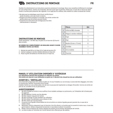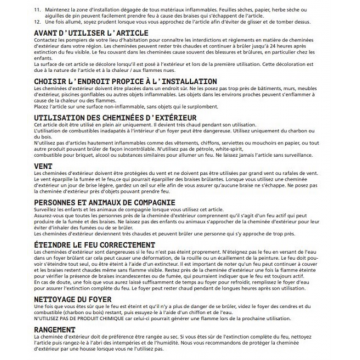 UTILISATION DES CHEMINÉES D’EXTÉRIEUR Cet article doit être utilisé en plein air uniquement. Il devient très chaud pendant son utilisation. L’utilisation de combustibles inadapatés à l’intérieur d’un foyer peut être dangereuse. Utilisez uniquement du charbon ou du bois. N’utilisez pas d’articles hautement inflammables comme des vêtements, chiffons, serviettes ou mouchoirs en papier, ou tout autre produit pouvant brûler de façon incontrôlable. N’utilisez pas de pétrole, white-spirit, combustible pour briquet, alcool ou substances similaires pour allumer un feu. Ne laissez jamais l’article sans surveillance.