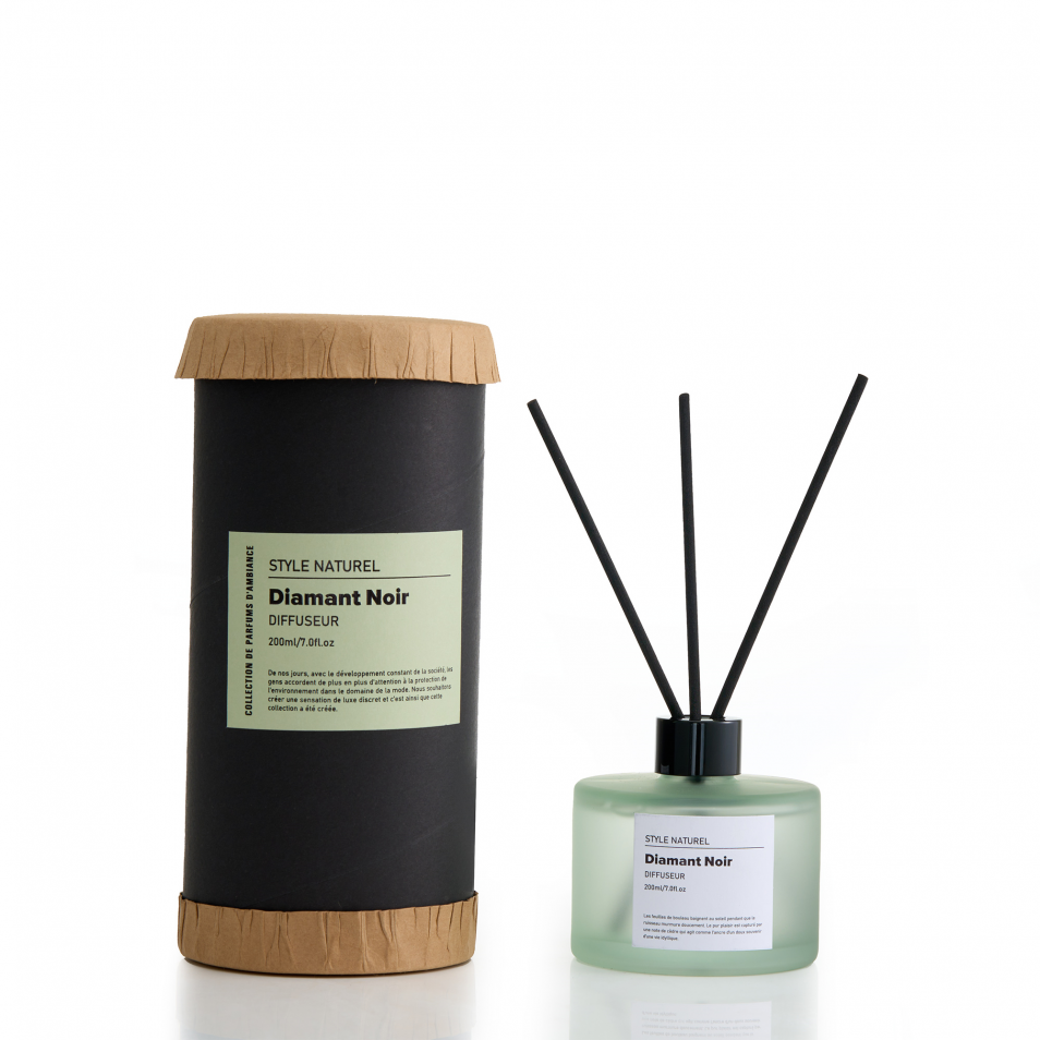 Diffuseur 200ml, flacon en verre fumé, 7 bâtonnets de roseau, dans une boîte faite main - Diamant Noir