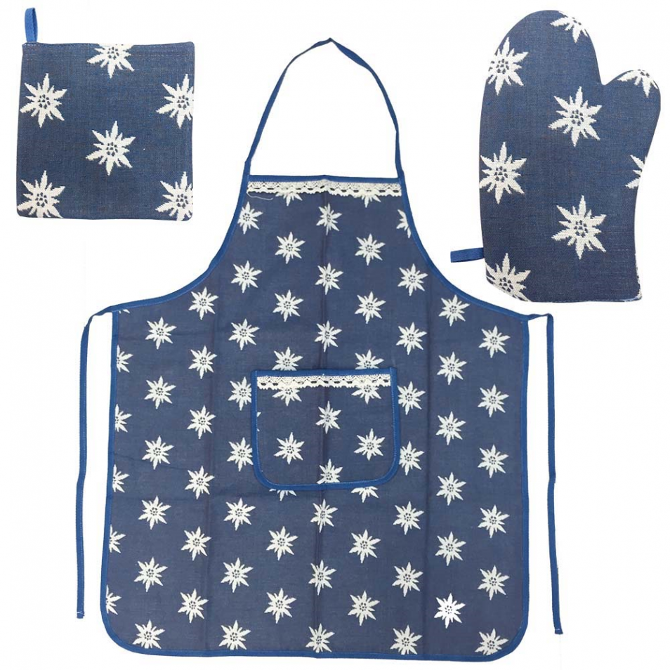 JFH042 série, 1 pièce de tablier 72x82cm, 1 pièce de ensemble de tapis anti - échaudage 19x19cm, 1 pièce de gant 18x28cm, bleu